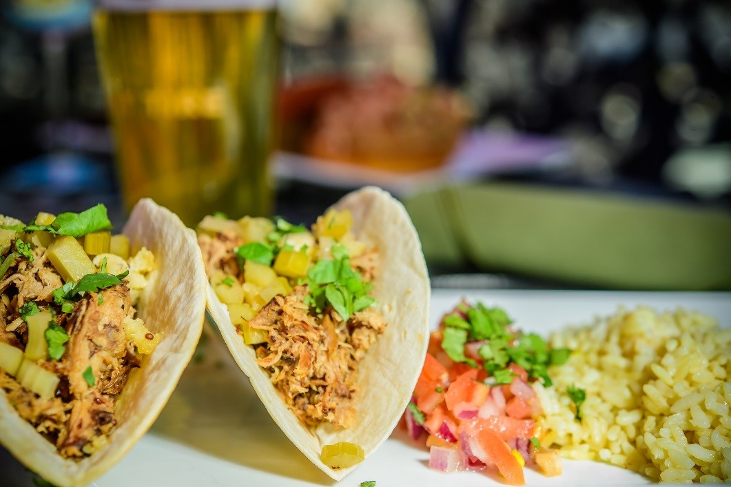 Pork Tacos (Lunch) Pulled pork, Red Dragon Cheddar, house-made giardiniera (banana peppers, onion, celery), saffron rice.