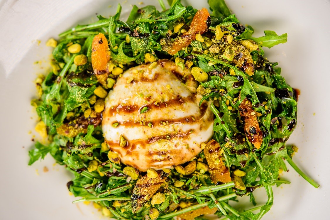 Summer Burratta Salad (Lunch & Dinner) Arugula, grilled apricots, pistachios, honey balsamic syrup.
